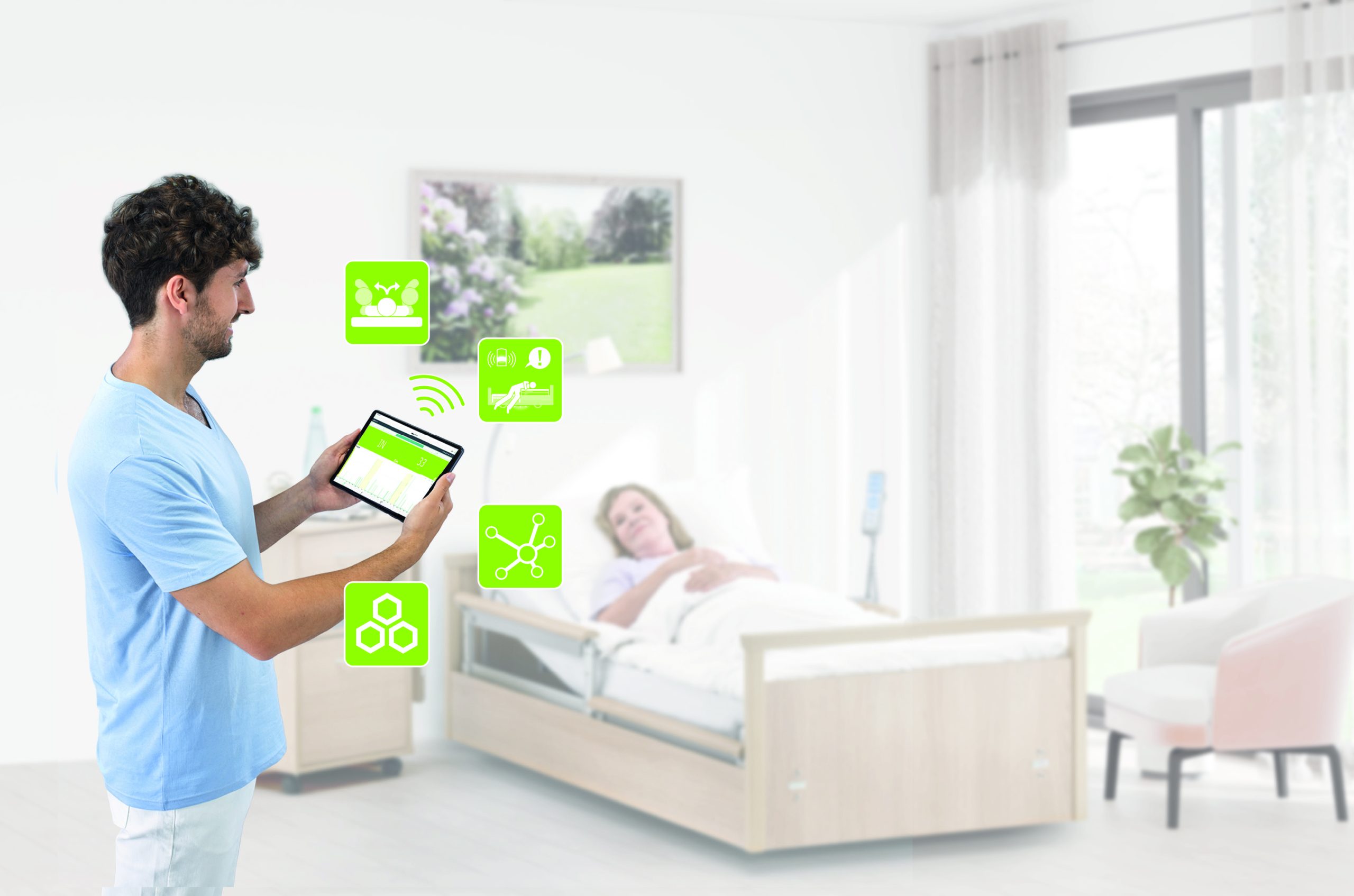 In this way, the nursing beds with resident monitoring optimise information and time management in care. And thus relieve the nursing staff. „A relief for our staff. Especially for night duty, where often only a few staff are assigned,“ says the managing director of Vechtetal. On tablet and co., caregivers can see when seniors are in or out of bed. Through a sensor mat under the mattress, the system also notices changes in pressure. The smart tools thus not only serve to detect falls at an early stage. At the same time, they provide an alarm system for repositioning and thus prevent pressure sores. „We can also recognise an incorrect medication setting from an unsettled sleep profile,“ says Jonker.